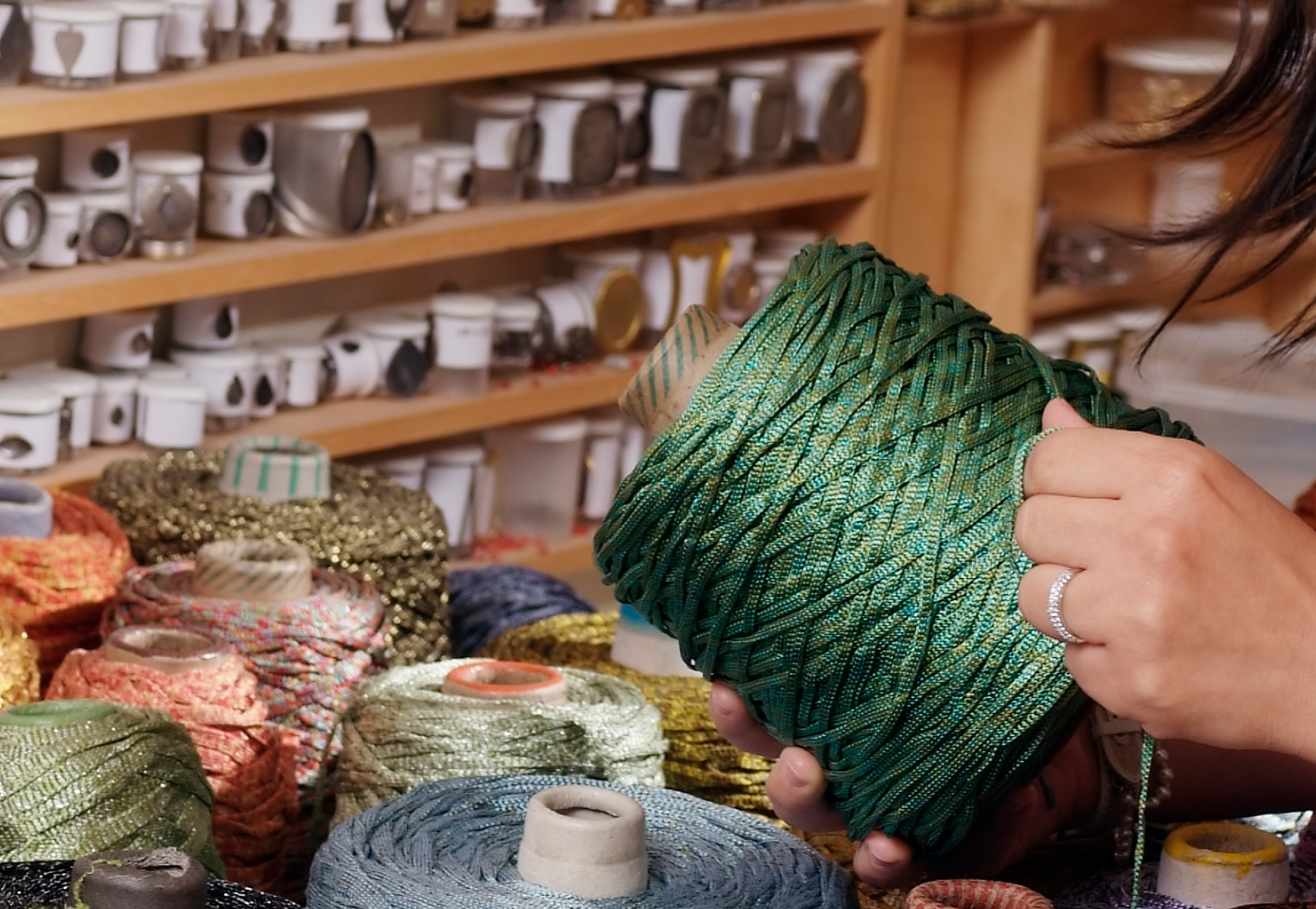 Ayala Bar’s studio shop is a vibrant, spacious haven where every corner reveals a new world of materials, colors, and shapes, all full of life. The studio is bursting with colorful threads in various textures, beads in every size and hue, and a vast collection of fabrics, all coming together to create an atmosphere of boundless creativity.