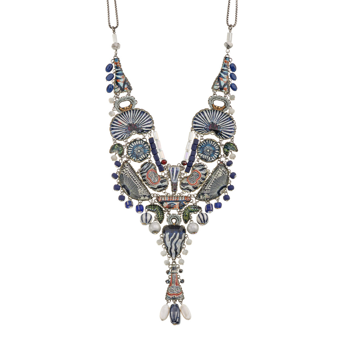The metallic elements in the jewelry are made from brass plated with silver or gold and include uniquely designed components, chains, and beads. Through techniques such as connecting, gluing, wrapping, and threading, the metals become a dynamic element that adds texture and color to the overall composition of every piece. In addition to their major aesthetic role, the metal parts also provide the framework and foundation for combining other materials.