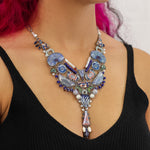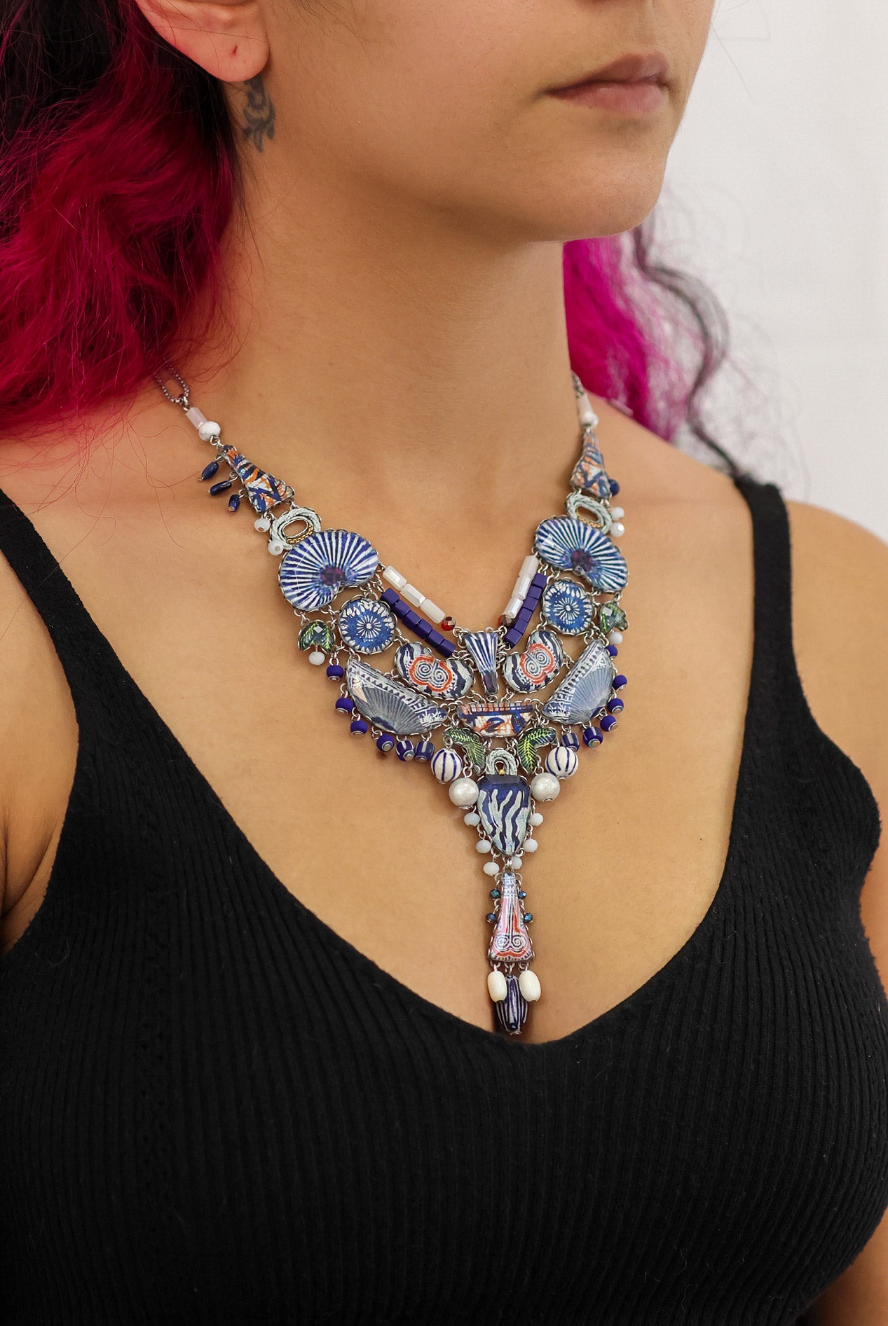 Textile plays a central role in Ayala Bar's designs. Unexpected combinations of fabric, thread, lace, tassels, and pompoms are hallmarks of her work. The artist employs techniques such as embroidery, weaving, knitting, gluing, and hand sewing, with each collection introducing new methods and fresh concepts. The fabrics feature striking prints and textures and are sourced mainly from India, the Middle East, and Morocco. One of the artist’s main uses of fabric is in bead-making, where she combines it with glass to create vibrant, uniquely crafted beads.