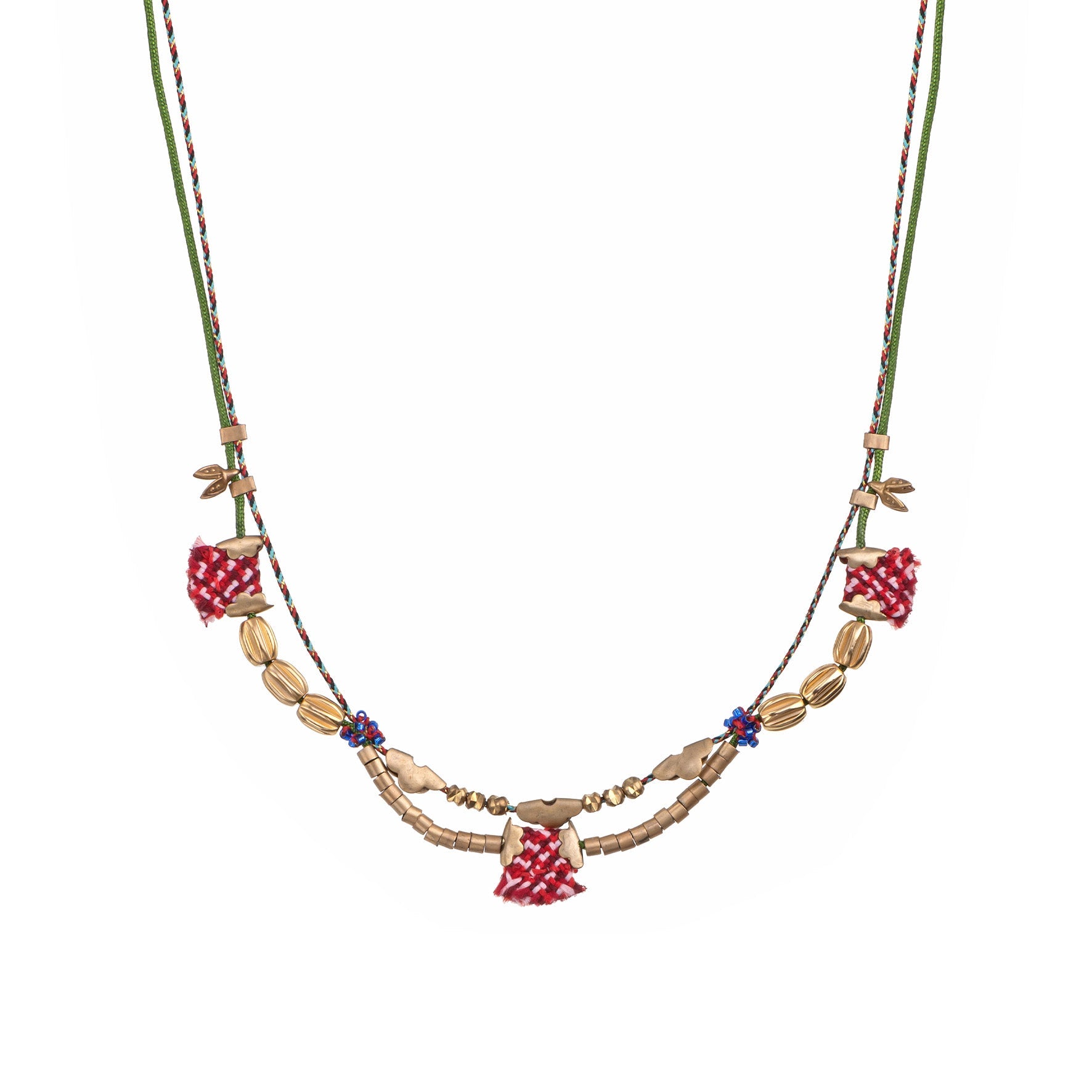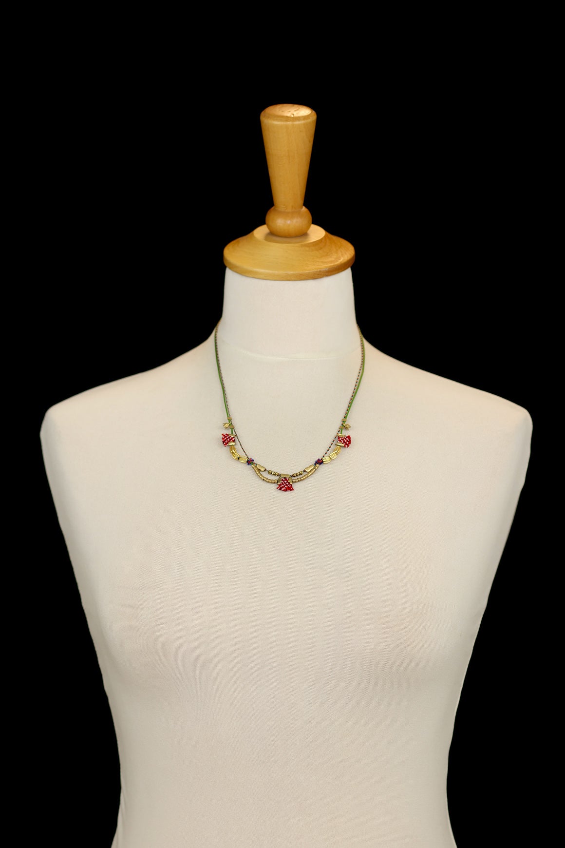 The metallic elements in the jewelry are made from brass plated with silver or gold and include uniquely designed components, chains, and beads. Through techniques such as connecting, gluing, wrapping, and threading, the metals become a dynamic element that adds texture and color to the overall composition of every piece. In addition to their major aesthetic role, the metal parts also provide the framework and foundation for combining other materials.