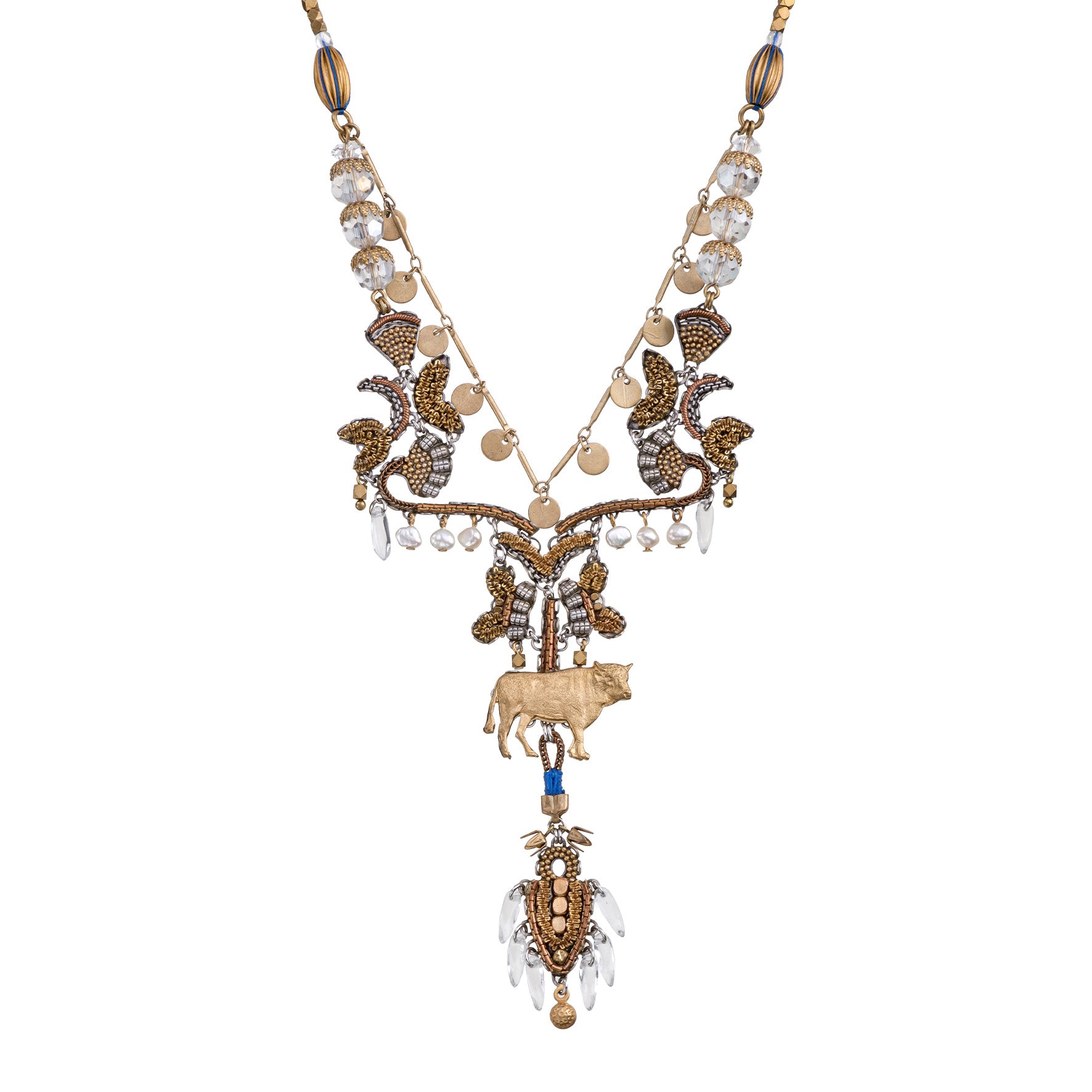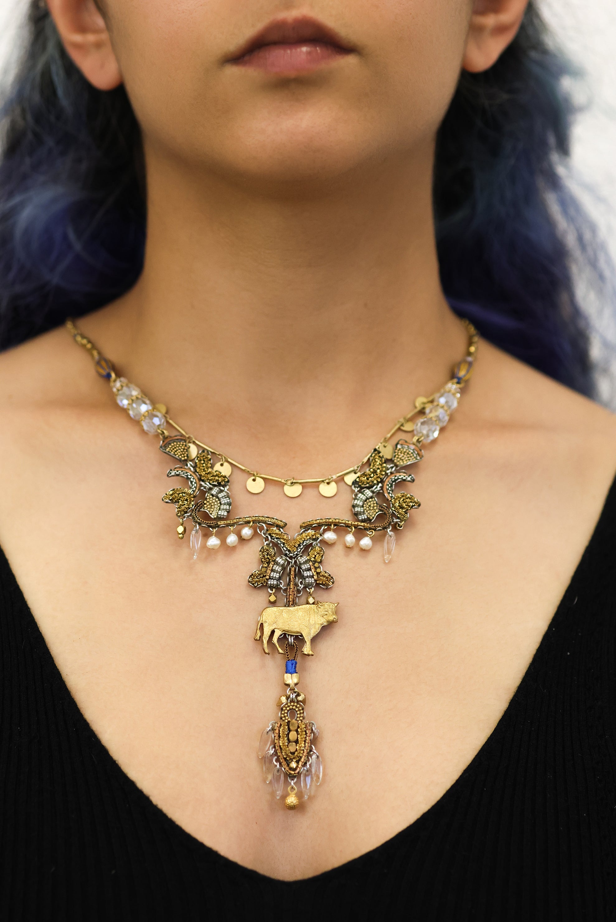 The metallic elements in the jewelry are made from brass plated with silver or gold and include uniquely designed components, chains, and beads. Through techniques such as connecting, gluing, wrapping, and threading, the metals become a dynamic element that adds texture and color to the overall composition of every piece. In addition to their major aesthetic role, the metal parts also provide the framework and foundation for combining other materials.