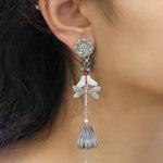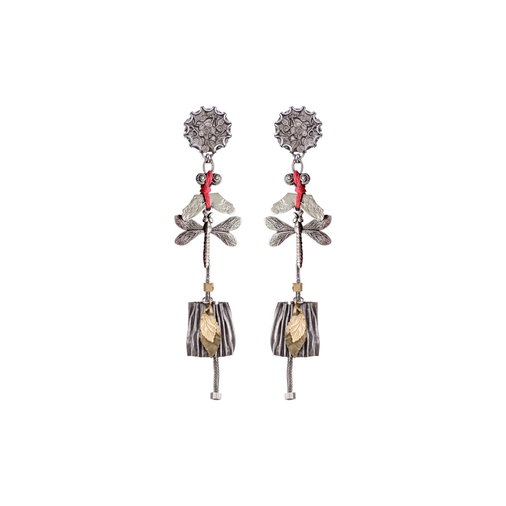 The metallic elements in the jewelry are made from brass plated with silver or gold and include uniquely designed components, chains, and beads. Through techniques such as connecting, gluing, wrapping, and threading, the metals become a dynamic element that adds texture and color to the overall composition of every piece. In addition to their major aesthetic role, the metal parts also provide the framework and foundation for combining other materials.
