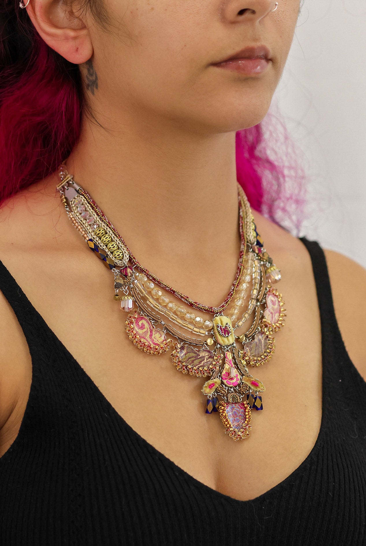 Textile plays a central role in Ayala Bar's designs. Unexpected combinations of fabric, thread, lace, tassels, and pompoms are hallmarks of her work. The artist employs techniques such as embroidery, weaving, knitting, gluing, and hand sewing, with each collection introducing new methods and fresh concepts. The fabrics feature striking prints and textures and are sourced mainly from India, the Middle East, and Morocco. One of the artist’s main uses of fabric is in bead-making, where she combines it with glass to create vibrant, uniquely crafted beads.