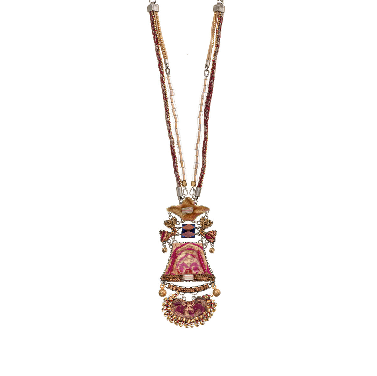 Textile plays a central role in Ayala Bar's designs. Unexpected combinations of fabric, thread, lace, tassels, and pompoms are hallmarks of her work. The artist employs techniques such as embroidery, weaving, knitting, gluing, and hand sewing, with each collection introducing new methods and fresh concepts. The fabrics feature striking prints and textures and are sourced mainly from India, the Middle East, and Morocco. One of the artist’s main uses of fabric is in bead-making, where she combines it with glass to create vibrant, uniquely crafted beads.