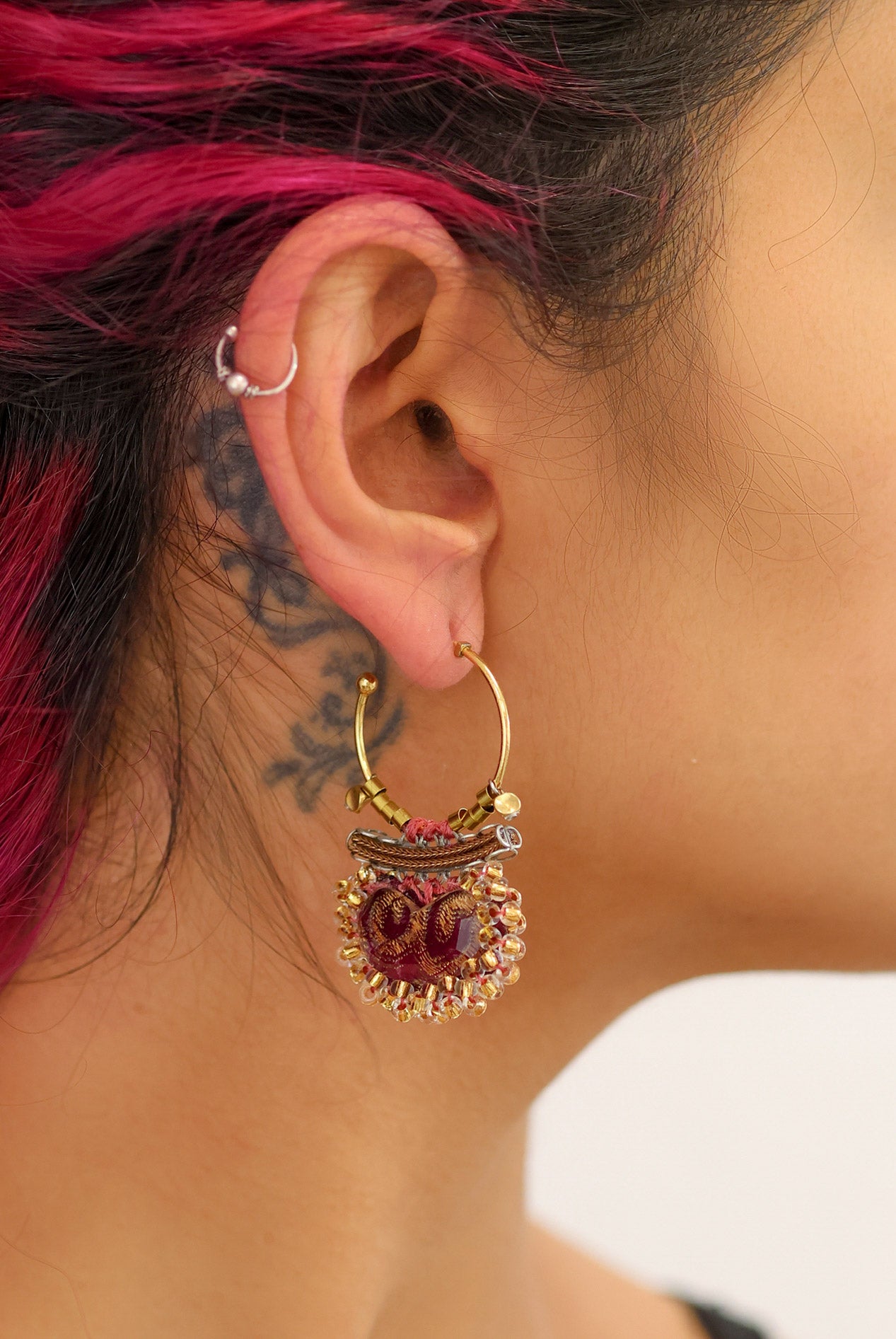 Textile plays a central role in Ayala Bar's designs. Unexpected combinations of fabric, thread, lace, tassels, and pompoms are hallmarks of her work. The artist employs techniques such as embroidery, weaving, knitting, gluing, and hand sewing, with each collection introducing new methods and fresh concepts. The fabrics feature striking prints and textures and are sourced mainly from India, the Middle East, and Morocco. One of the artist’s main uses of fabric is in bead-making, where she combines it with glass to create vibrant, uniquely crafted beads.