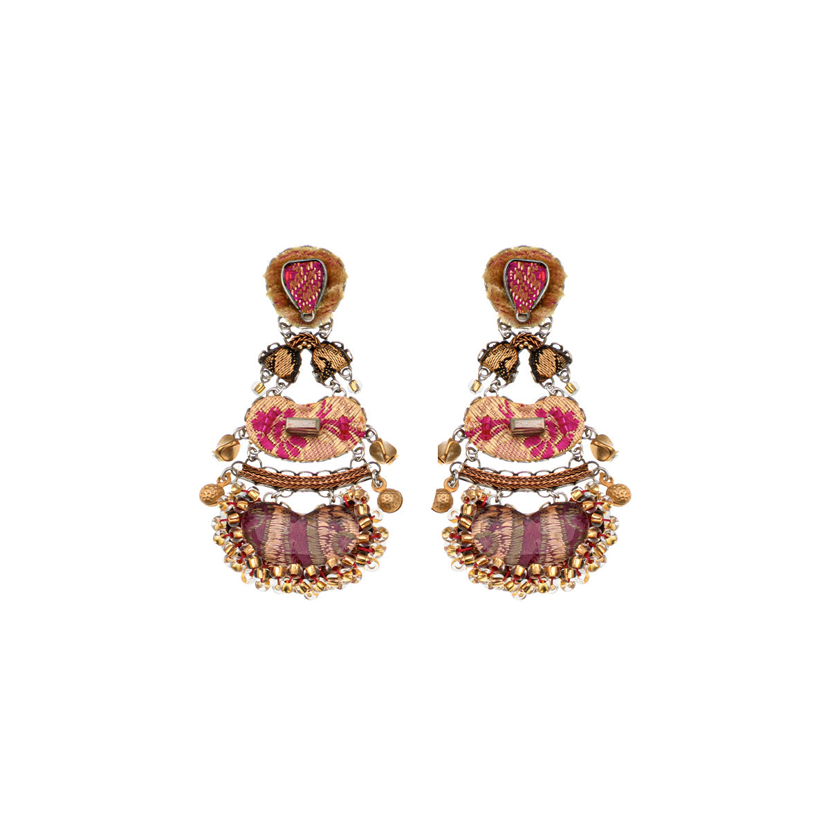 Textile plays a central role in Ayala Bar's designs. Unexpected combinations of fabric, thread, lace, tassels, and pompoms are hallmarks of her work. The artist employs techniques such as embroidery, weaving, knitting, gluing, and hand sewing, with each collection introducing new methods and fresh concepts. The fabrics feature striking prints and textures and are sourced mainly from India, the Middle East, and Morocco. One of the artist’s main uses of fabric is in bead-making, where she combines it with glass to create vibrant, uniquely crafted beads.