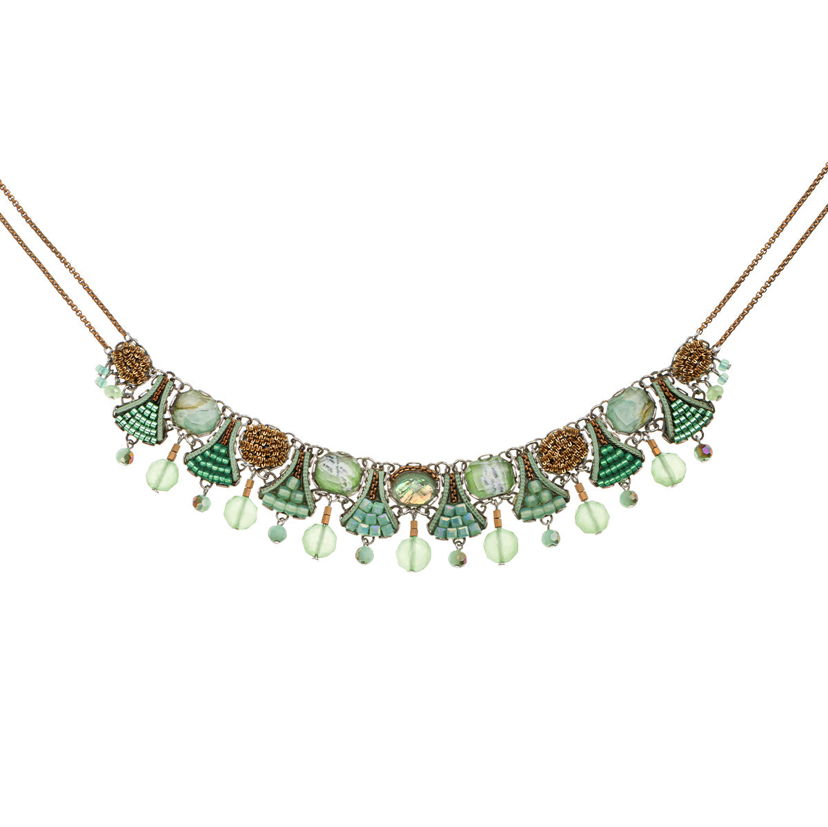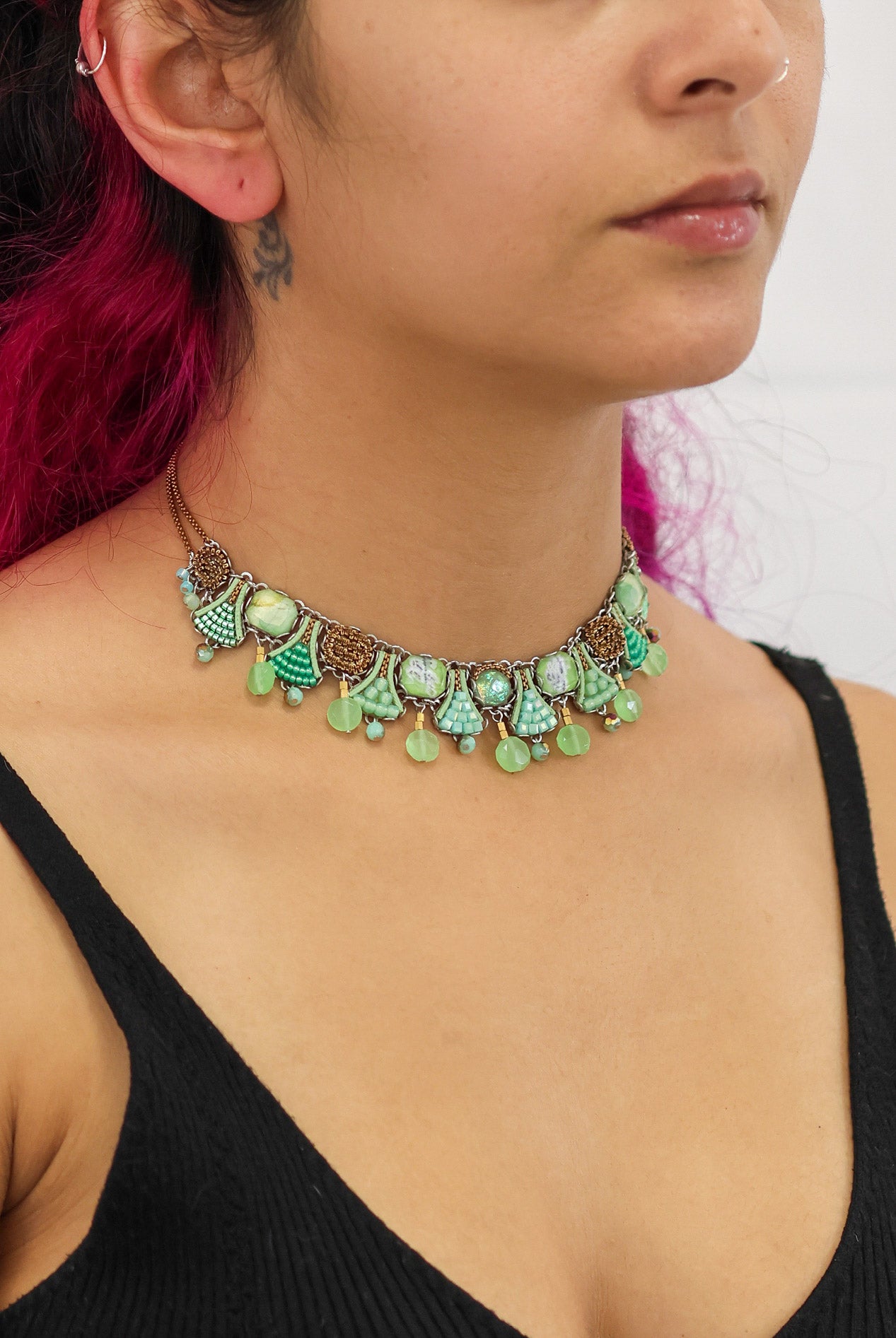 The metallic elements in the jewelry are made from brass plated with silver or gold and include uniquely designed components, chains, and beads. Through techniques such as connecting, gluing, wrapping, and threading, the metals become a dynamic element that adds texture and color to the overall composition of every piece. In addition to their major aesthetic role, the metal parts also provide the framework and foundation for combining other materials.