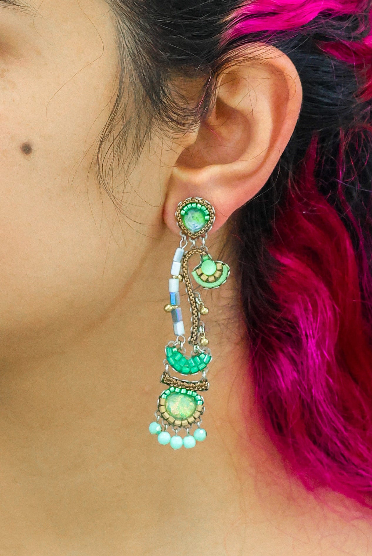 The metallic elements in the jewelry are made from brass plated with silver or gold and include uniquely designed components, chains, and beads. Through techniques such as connecting, gluing, wrapping, and threading, the metals become a dynamic element that adds texture and color to the overall composition of every piece. In addition to their major aesthetic role, the metal parts also provide the framework and foundation for combining other materials.