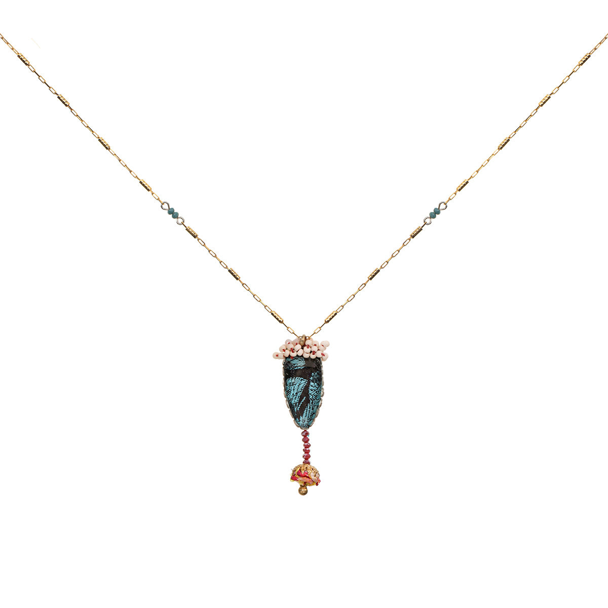 The metallic elements in the jewelry are made from brass plated with silver or gold and include uniquely designed components, chains, and beads. Through techniques such as connecting, gluing, wrapping, and threading, the metals become a dynamic element that adds texture and color to the overall composition of every piece. In addition to their major aesthetic role, the metal parts also provide the framework and foundation for combining other materials.