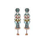 The metallic elements in the jewelry are made from brass plated with silver or gold and include uniquely designed components, chains, and beads. Through techniques such as connecting, gluing, wrapping, and threading, the metals become a dynamic element that adds texture and color to the overall composition of every piece. In addition to their major aesthetic role, the metal parts also provide the framework and foundation for combining other materials.