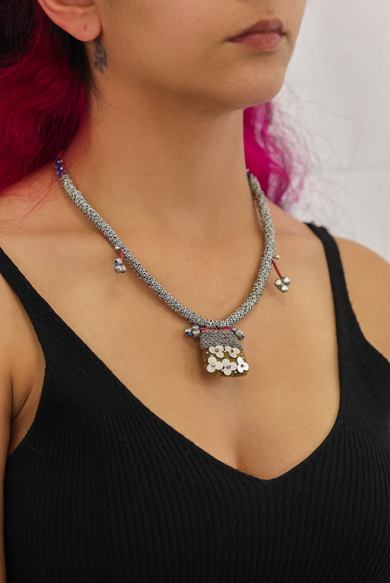 The metallic elements in the jewelry are made from brass plated with silver or gold and include uniquely designed components, chains, and beads. Through techniques such as connecting, gluing, wrapping, and threading, the metals become a dynamic element that adds texture and color to the overall composition of every piece. In addition to their major aesthetic role, the metal parts also provide the framework and foundation for combining other materials.