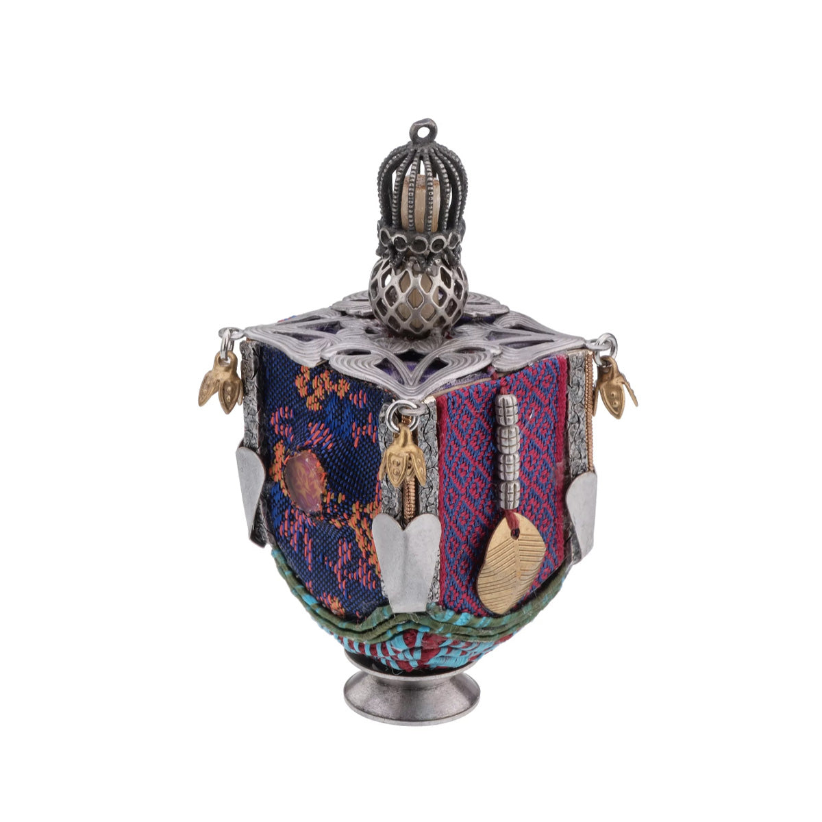 Textile plays a central role in Ayala Bar's designs. Unexpected combinations of fabric, thread, lace, tassels, and pompoms are hallmarks of her work. The artist employs techniques such as embroidery, weaving, knitting, gluing, and hand sewing, with each collection introducing new methods and fresh concepts. The fabrics feature striking prints and textures and are sourced mainly from India, the Middle East, and Morocco. One of the artist’s main uses of fabric is in bead-making, where she combines it with glass to create vibrant, uniquely crafted beads.