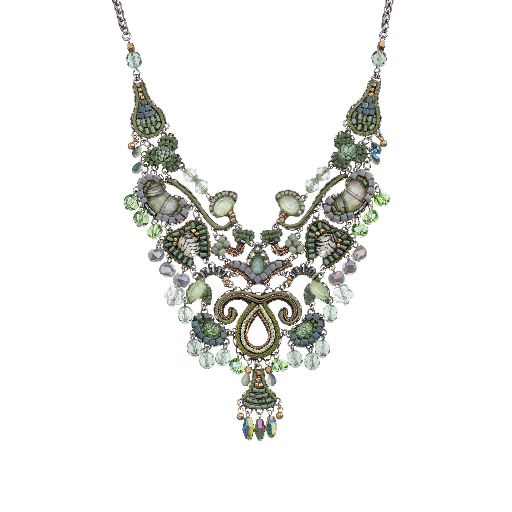 The metallic elements in the jewelry are made from brass plated with silver or gold and include uniquely designed components, chains, and beads. Through techniques such as connecting, gluing, wrapping, and threading, the metals become a dynamic element that adds texture and color to the overall composition of every piece. In addition to their major aesthetic role, the metal parts also provide the framework and foundation for combining other materials.