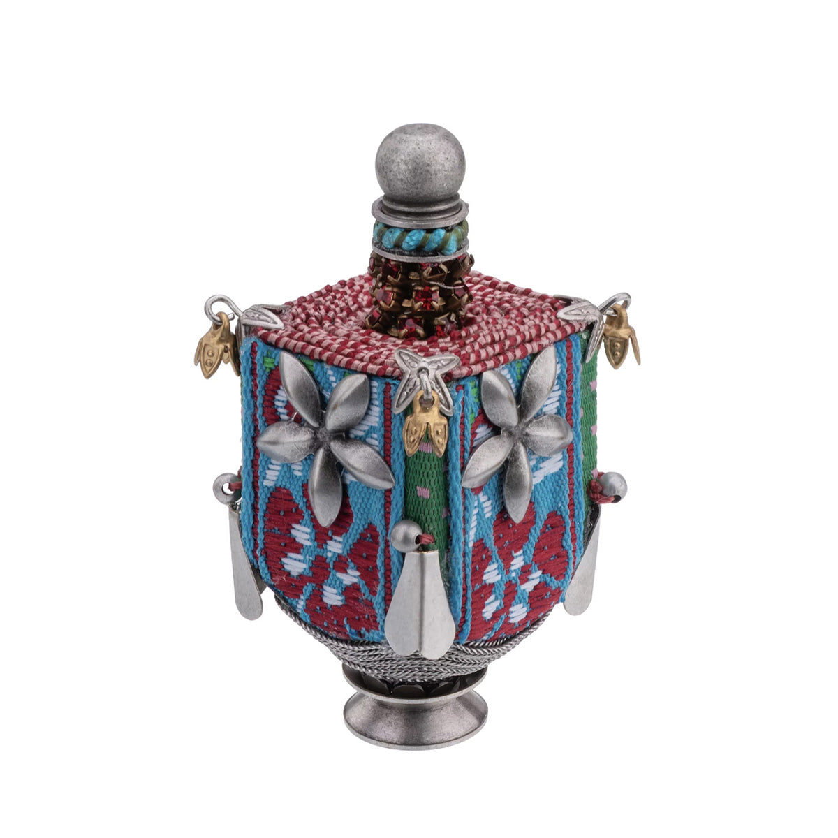 Textile plays a central role in Ayala Bar's designs. Unexpected combinations of fabric, thread, lace, tassels, and pompoms are hallmarks of her work. The artist employs techniques such as embroidery, weaving, knitting, gluing, and hand sewing, with each collection introducing new methods and fresh concepts. The fabrics feature striking prints and textures and are sourced mainly from India, the Middle East, and Morocco. One of the artist’s main uses of fabric is in bead-making, where she combines it with glass to create vibrant, uniquely crafted beads.