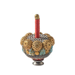 Textile plays a central role in Ayala Bar's designs. Unexpected combinations of fabric, thread, lace, tassels, and pompoms are hallmarks of her work. The artist employs techniques such as embroidery, weaving, knitting, gluing, and hand sewing, with each collection introducing new methods and fresh concepts. The fabrics feature striking prints and textures and are sourced mainly from India, the Middle East, and Morocco. One of the artist’s main uses of fabric is in bead-making, where she combines it with glass to create vibrant, uniquely crafted beads.