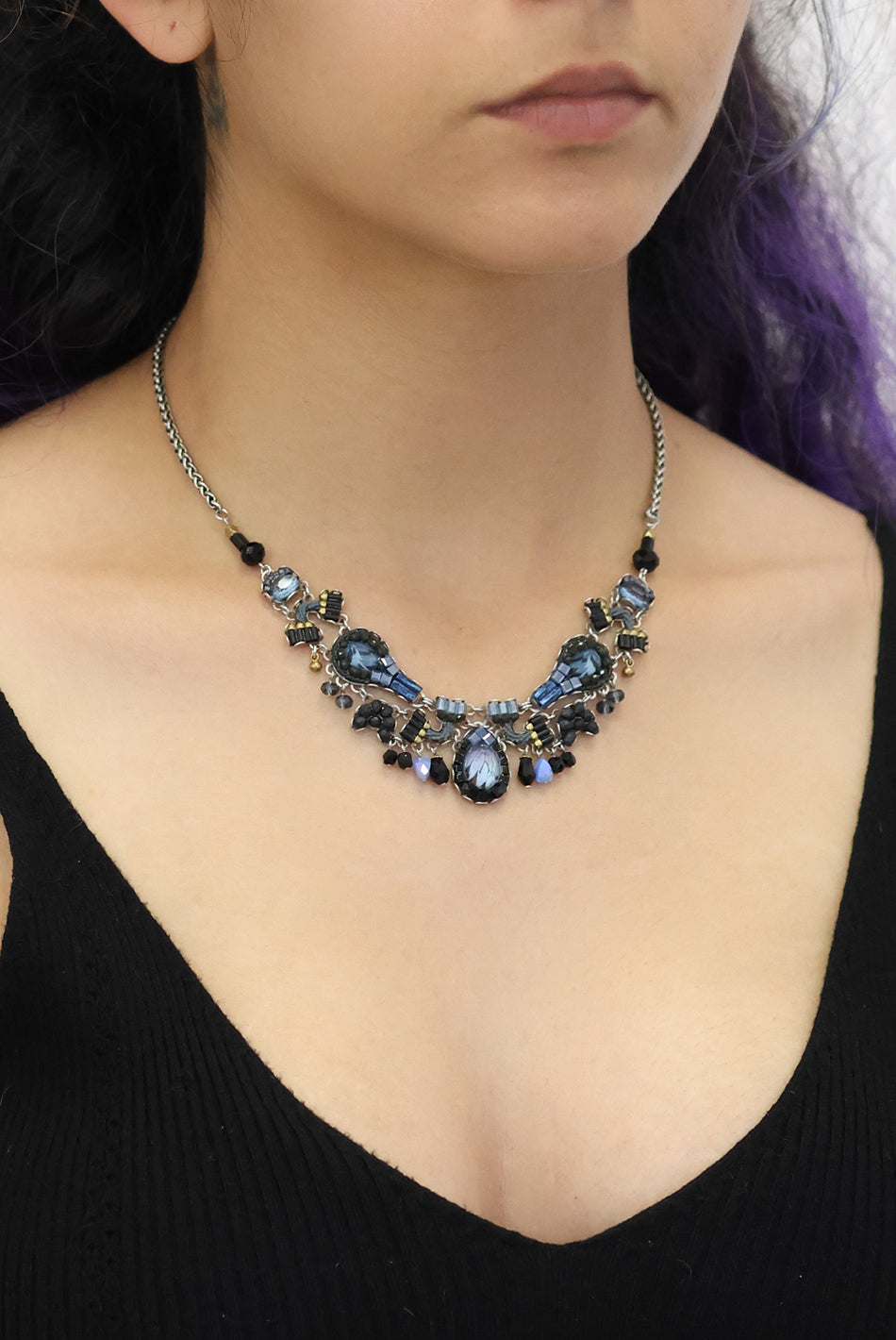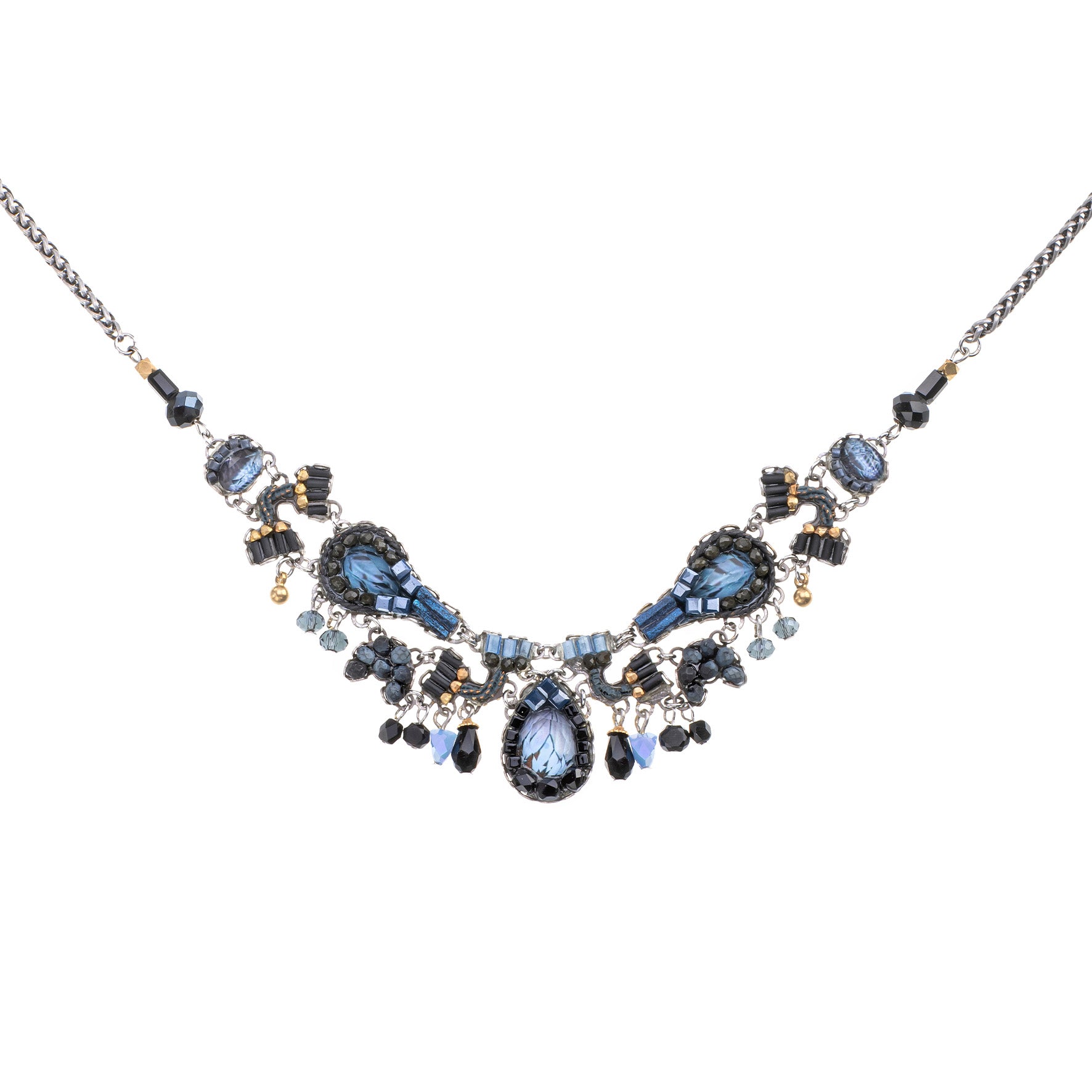 The metallic elements in the jewelry are made from brass plated with silver or gold and include uniquely designed components, chains, and beads. Through techniques such as connecting, gluing, wrapping, and threading, the metals become a dynamic element that adds texture and color to the overall composition of every piece. In addition to their major aesthetic role, the metal parts also provide the framework and foundation for combining other materials.