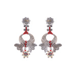 The metallic elements in the jewelry are made from brass plated with silver or gold and include uniquely designed components, chains, and beads. Through techniques such as connecting, gluing, wrapping, and threading, the metals become a dynamic element that adds texture and color to the overall composition of every piece. In addition to their major aesthetic role, the metal parts also provide the framework and foundation for combining other materials.