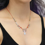 The metallic elements in the jewelry are made from brass plated with silver or gold and include uniquely designed components, chains, and beads. Through techniques such as connecting, gluing, wrapping, and threading, the metals become a dynamic element that adds texture and color to the overall composition of every piece. In addition to their major aesthetic role, the metal parts also provide the framework and foundation for combining other materials.