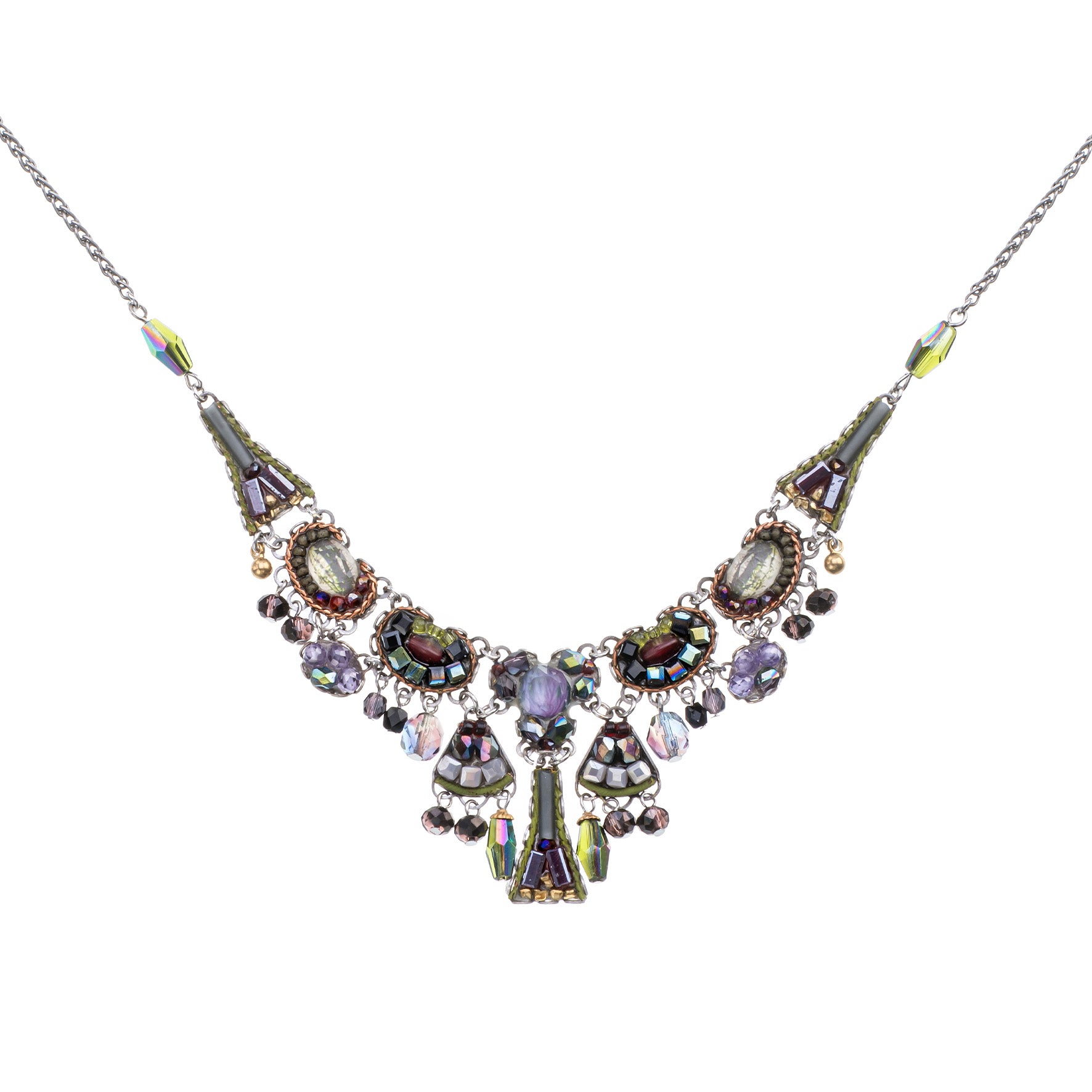 The metallic elements in the jewelry are made from brass plated with silver or gold and include uniquely designed components, chains, and beads. Through techniques such as connecting, gluing, wrapping, and threading, the metals become a dynamic element that adds texture and color to the overall composition of every piece. In addition to their major aesthetic role, the metal parts also provide the framework and foundation for combining other materials.