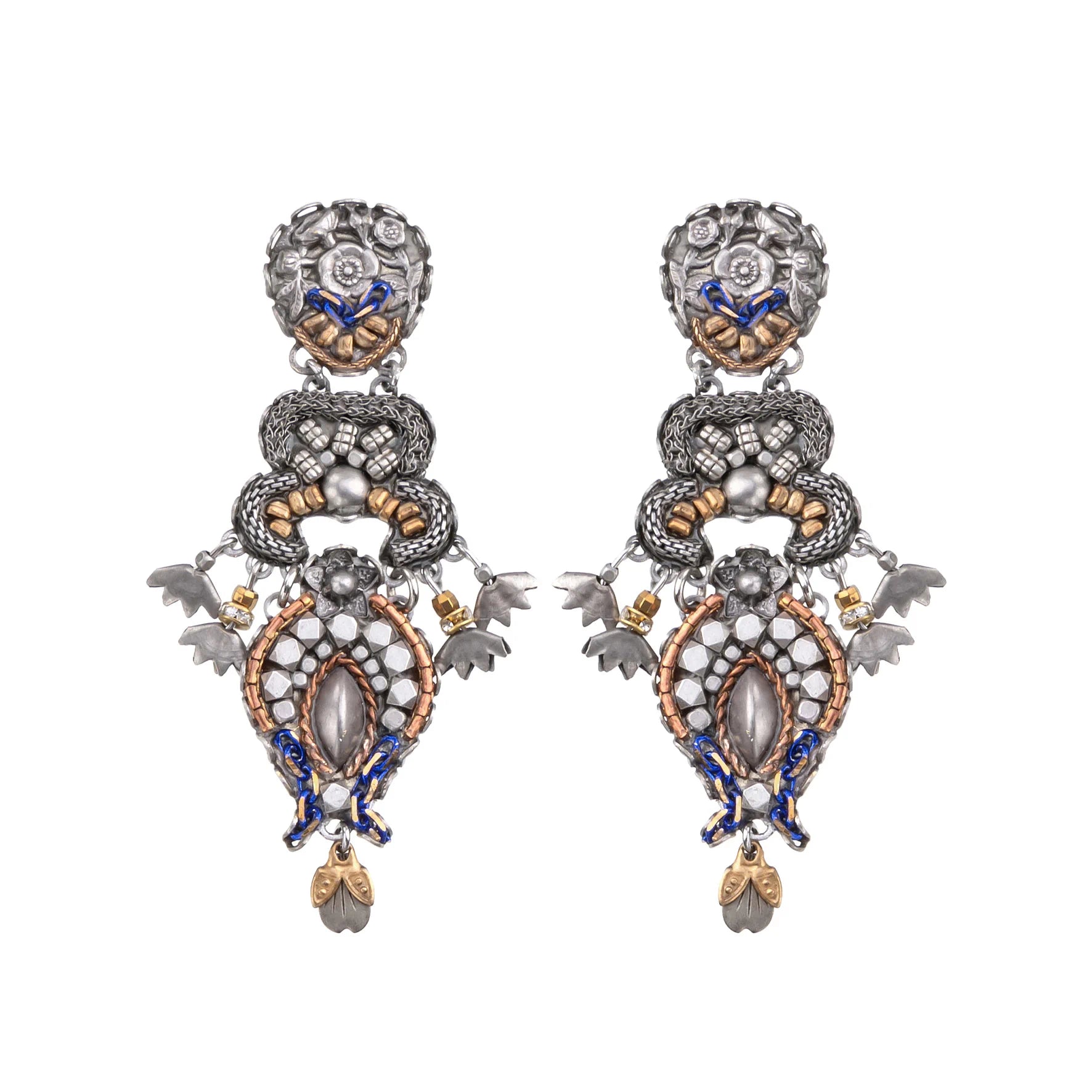 The metallic elements in the jewelry are made from brass plated with silver or gold and include uniquely designed components, chains, and beads. Through techniques such as connecting, gluing, wrapping, and threading, the metals become a dynamic element that adds texture and color to the overall composition of every piece. In addition to their major aesthetic role, the metal parts also provide the framework and foundation for combining other materials.