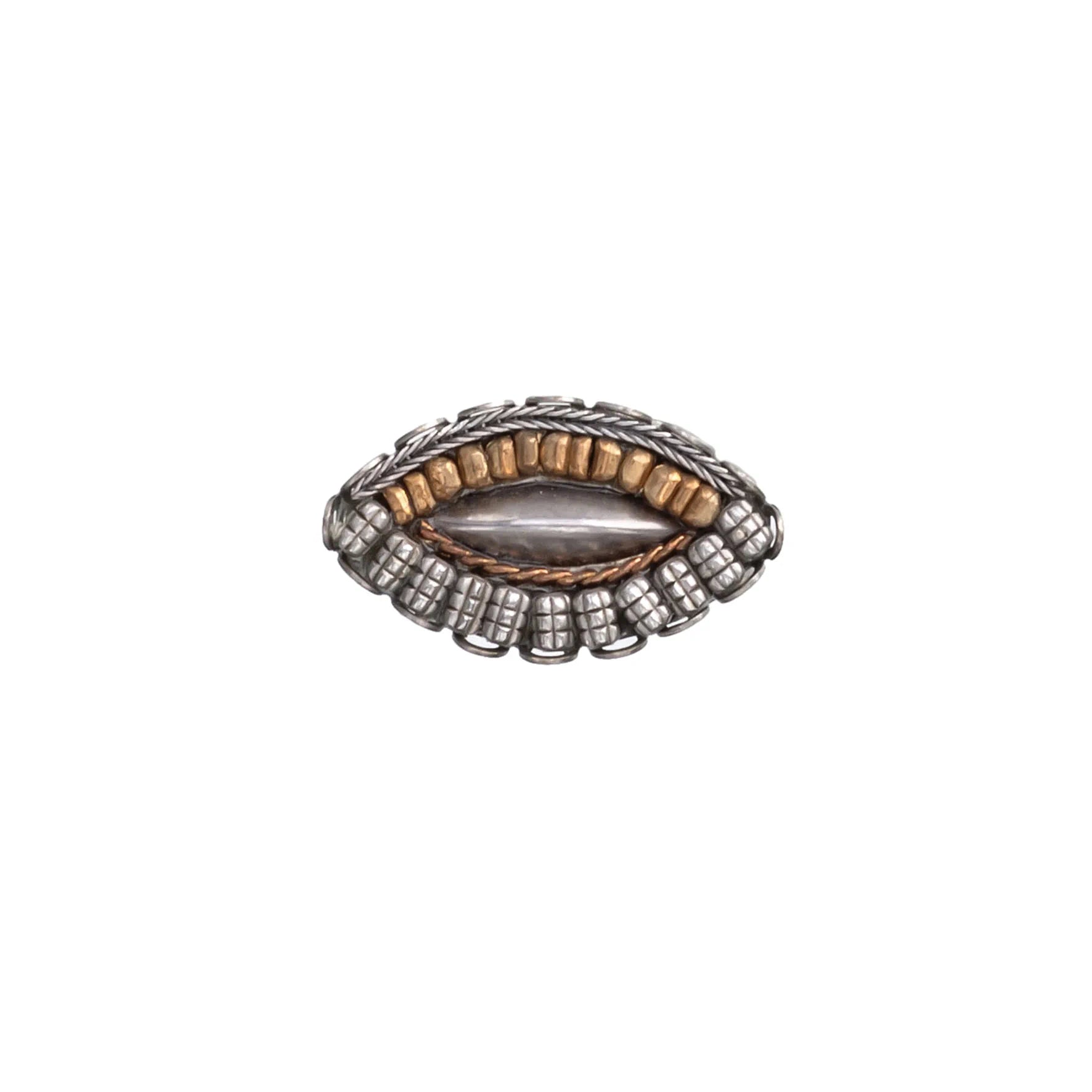 The metallic elements in the jewelry are made from brass plated with silver or gold and include uniquely designed components, chains, and beads. Through techniques such as connecting, gluing, wrapping, and threading, the metals become a dynamic element that adds texture and color to the overall composition of every piece. In addition to their major aesthetic role, the metal parts also provide the framework and foundation for combining other materials.
