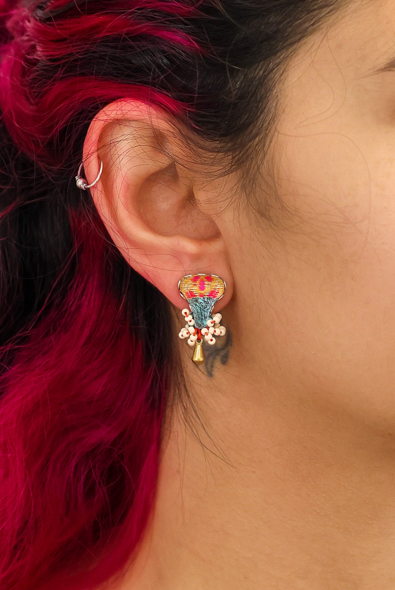 Textile plays a central role in Ayala Bar's designs. Unexpected combinations of fabric, thread, lace, tassels, and pompoms are hallmarks of her work. The artist employs techniques such as embroidery, weaving, knitting, gluing, and hand sewing, with each collection introducing new methods and fresh concepts. The fabrics feature striking prints and textures and are sourced mainly from India, the Middle East, and Morocco. One of the artist’s main uses of fabric is in bead-making, where she combines it with glass to create vibrant, uniquely crafted beads.