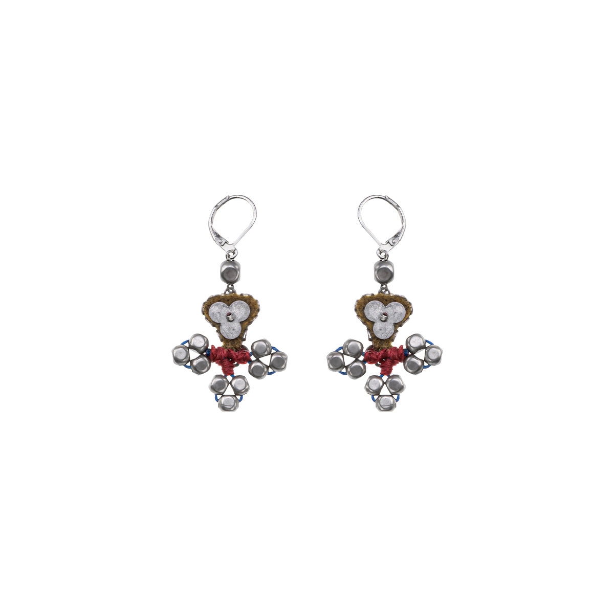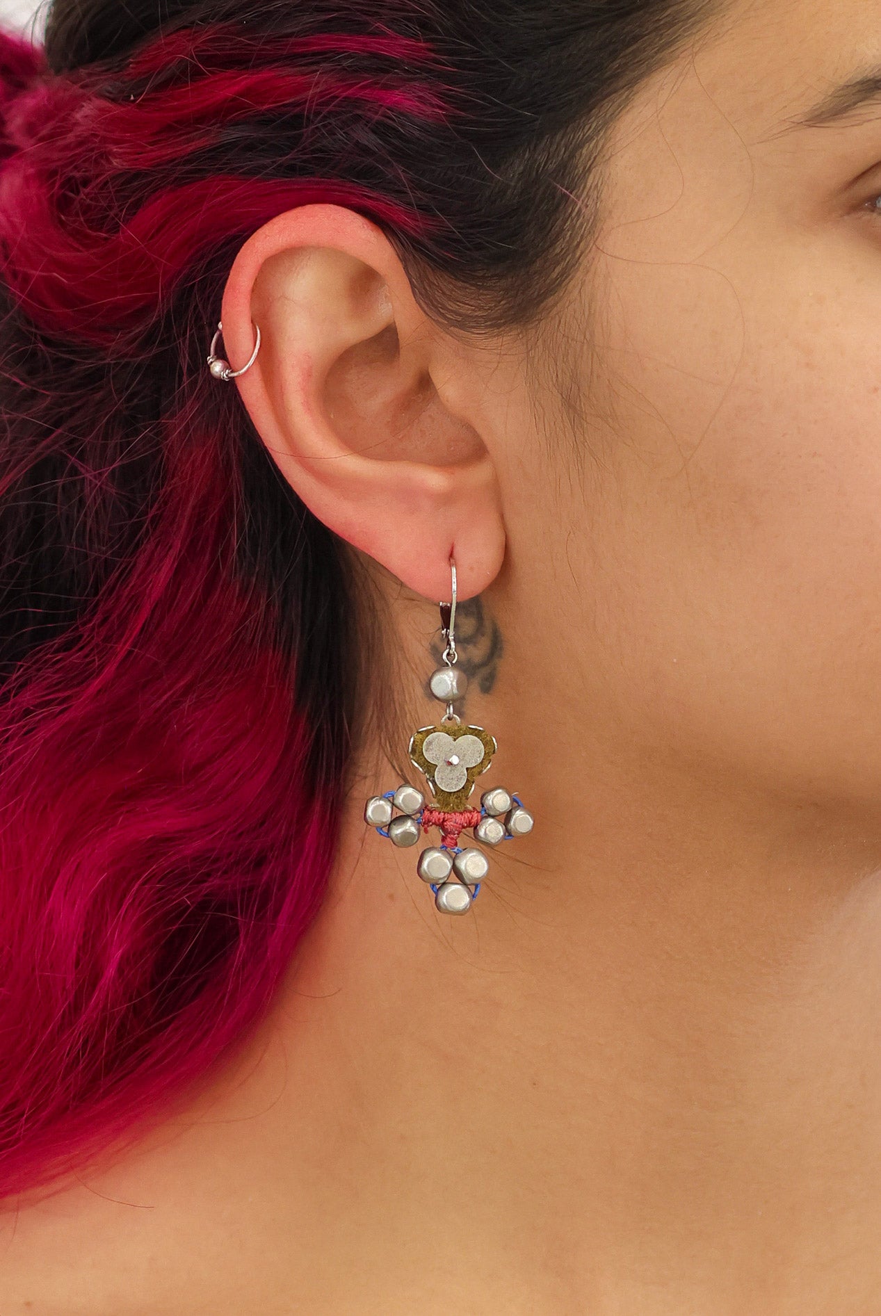 The metallic elements in the jewelry are made from brass plated with silver or gold and include uniquely designed components, chains, and beads. Through techniques such as connecting, gluing, wrapping, and threading, the metals become a dynamic element that adds texture and color to the overall composition of every piece. In addition to their major aesthetic role, the metal parts also provide the framework and foundation for combining other materials.
