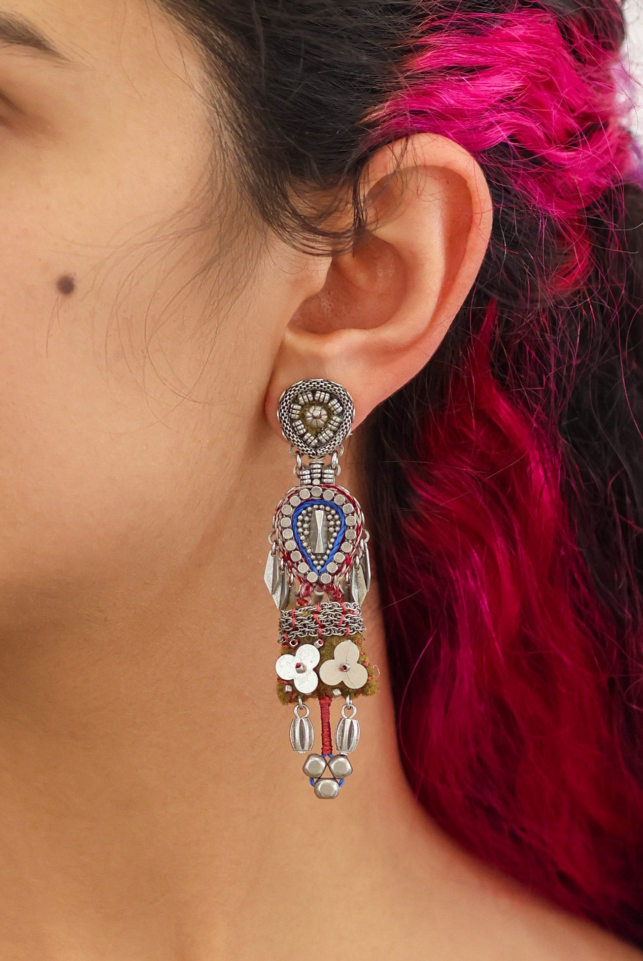 Textile plays a central role in Ayala Bar's designs. Unexpected combinations of fabric, thread, lace, tassels, and pompoms are hallmarks of her work. The artist employs techniques such as embroidery, weaving, knitting, gluing, and hand sewing, with each collection introducing new methods and fresh concepts. The fabrics feature striking prints and textures and are sourced mainly from India, the Middle East, and Morocco. One of the artist’s main uses of fabric is in bead-making, where she combines it with glass to create vibrant, uniquely crafted beads.